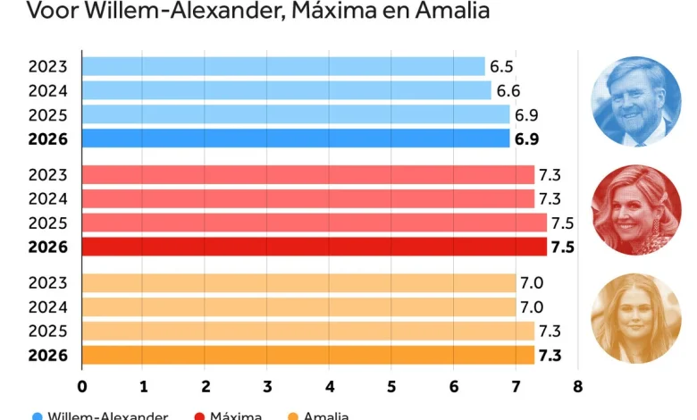 وأظهر الاستطلاع أن الفروقات في التقييم بين أفراد العائلة المالكة تبقى محدودة، حيث حصل الملك فيليم ألكسندر على تقييم يبلغ 6.9 من 10، وهو نفس مستوى العام الماضي، بينما سجلت الملكة ماكسيما والأميرة أماليا درجات أعلى قليلاً في مستوى الرضا العام.
